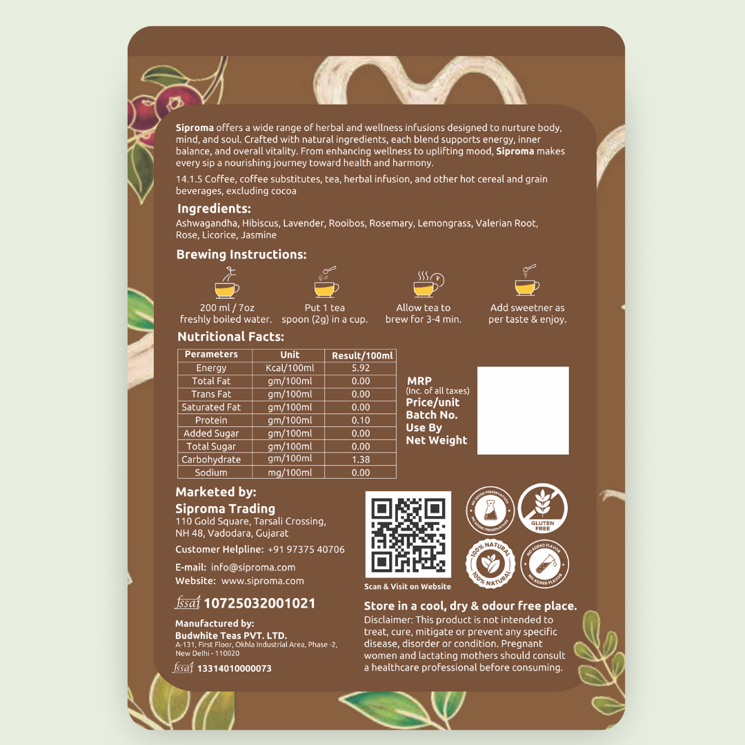 Unwind and restore your inner calm with Siproma Ashwagandha Relax Herbal Tea Tisane. This serene blend brings together ashwagandha and a carefully selected mix of calming herbs and aromatic flowers to create a deeply soothing and comforting infusion.