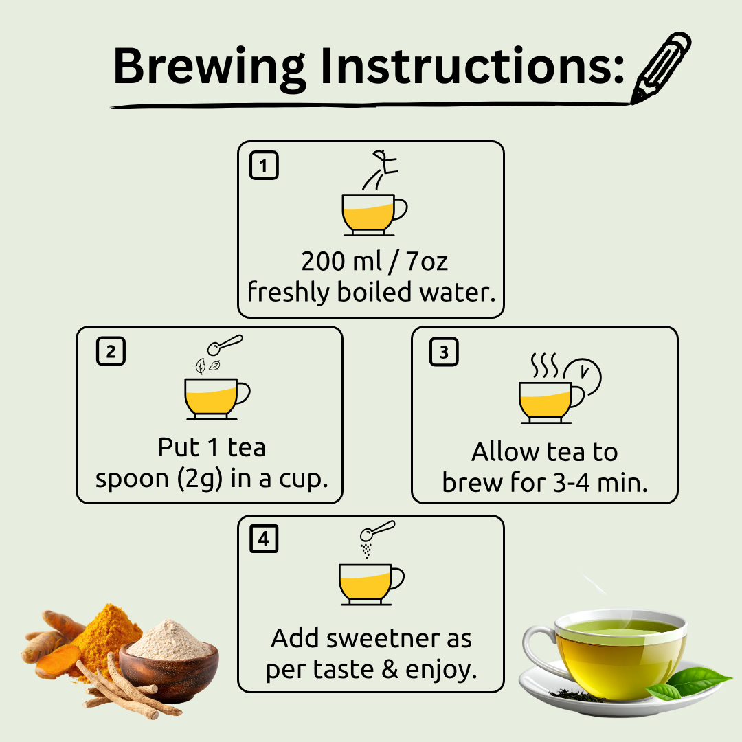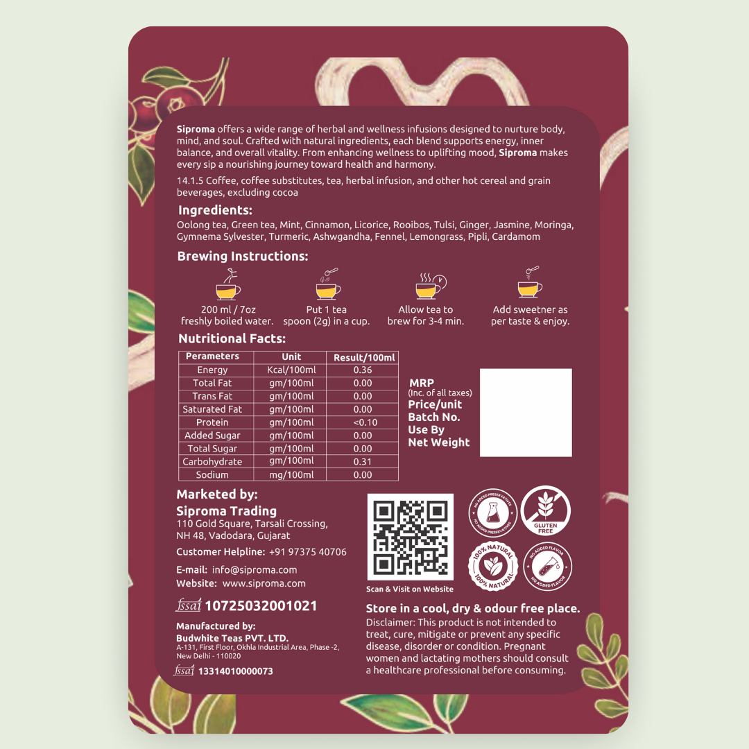 Mint, ginger, cinnamon, and lemongrass provide a refreshing and aromatic base, while traditional wellness ingredients such as tulsi, moringa, turmeric, ashwagandha, and gymnema sylvester support metabolism, inner balance, and overall vitality. Floral notes of jasmine and warming spices like cardamom and pipli create a smooth, comforting finish that makes this blend ideal for daily enjoyment.