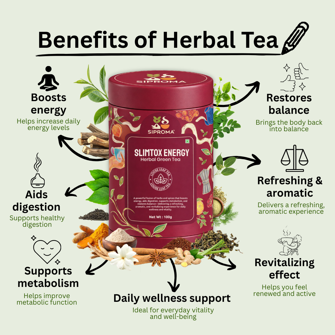 Recharge your body and refresh your senses with Siproma SlimTox Energy Herbal Green Tea. This powerful wellness infusion blends green tea and oolong tea with a carefully balanced selection of herbs, spices, and botanicals known for their revitalizing and digestive-supporting properties.